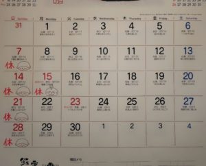 さて、今月の店休日は