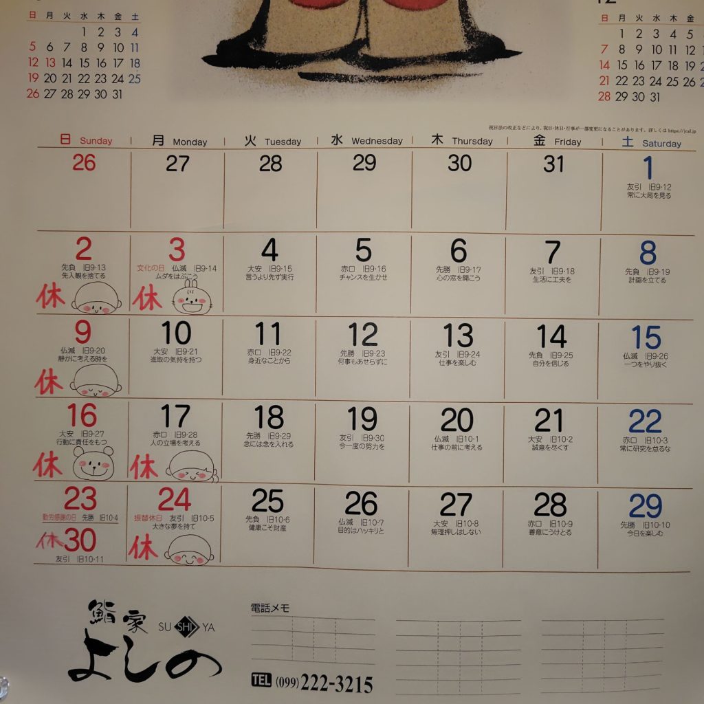 さて、今月の店休日は
